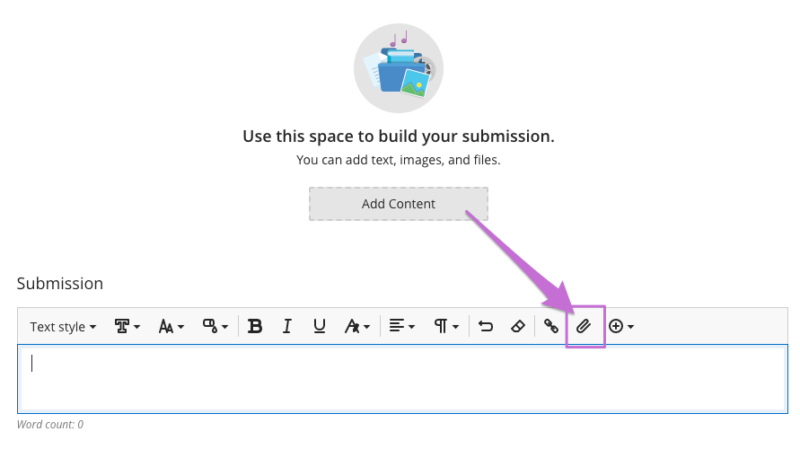 Submit a file or embed an image by clicking the attachment icon (paperclip) or drag and drop images and documents into the Submission field. (Note: you can also ‘share’ your assignment from your OneDrive account - embed the sharing link in the submission field)