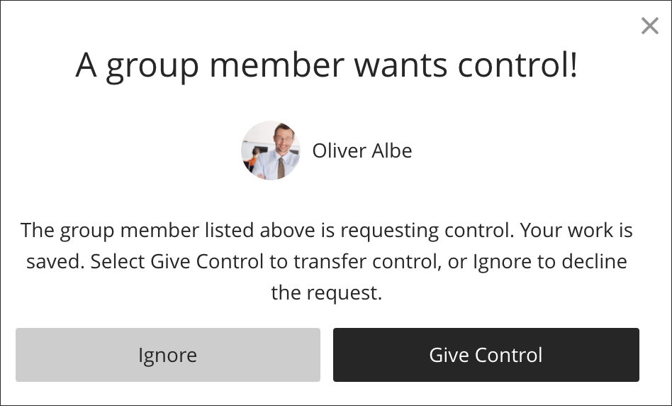 Everyone in the group can keep track of the latest version of the work. When a group member opens a group assignment, the assignment is locked so other members can't edit it. Other group members can request to work on the assignment. The member in control can approve or decline the request.