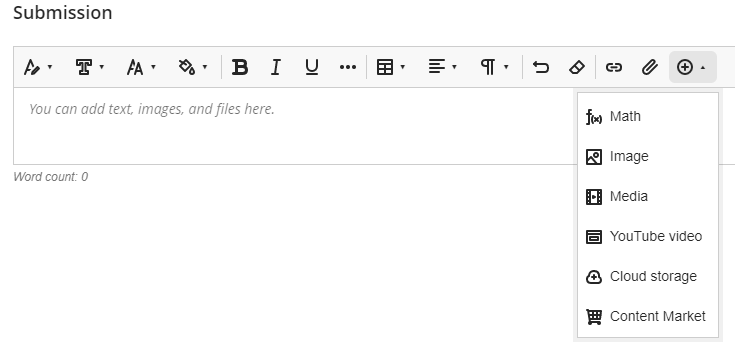 4. Click in the Submission field to use the editor to submit your assignment in the format requested by your instructor. Only your instructor can view the content you add.
