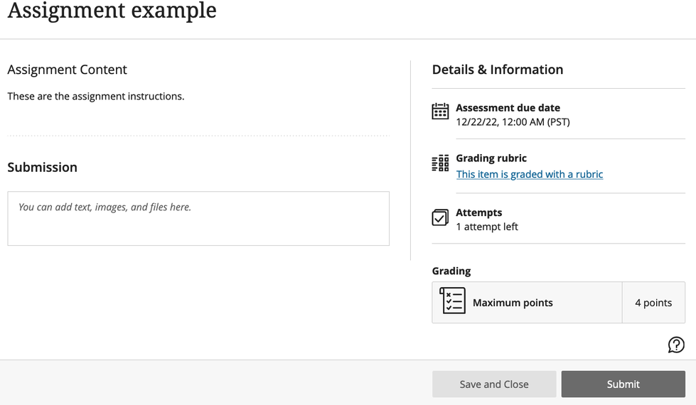 Review the Details and Information panel on the right for important information about the assignment. You will see: