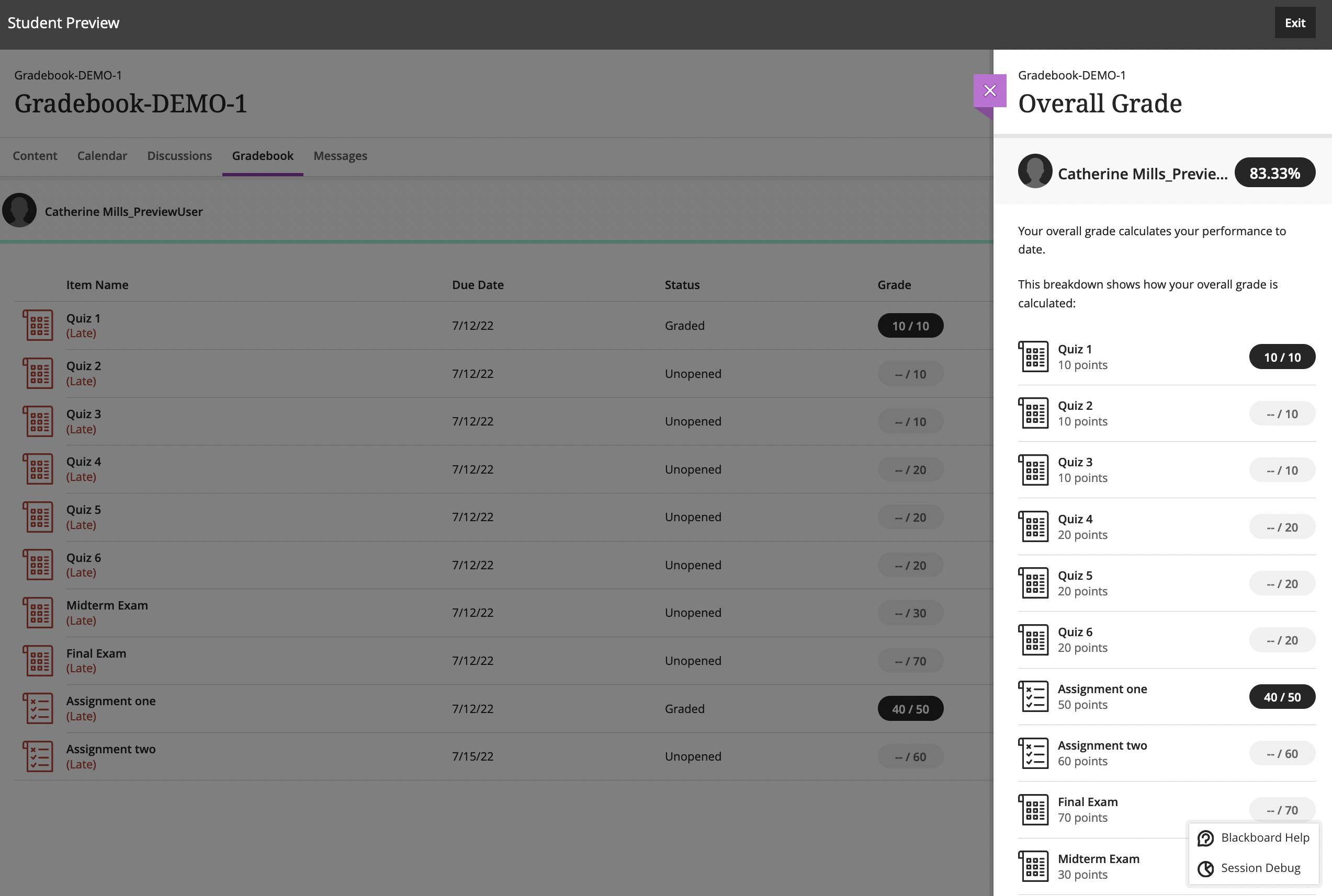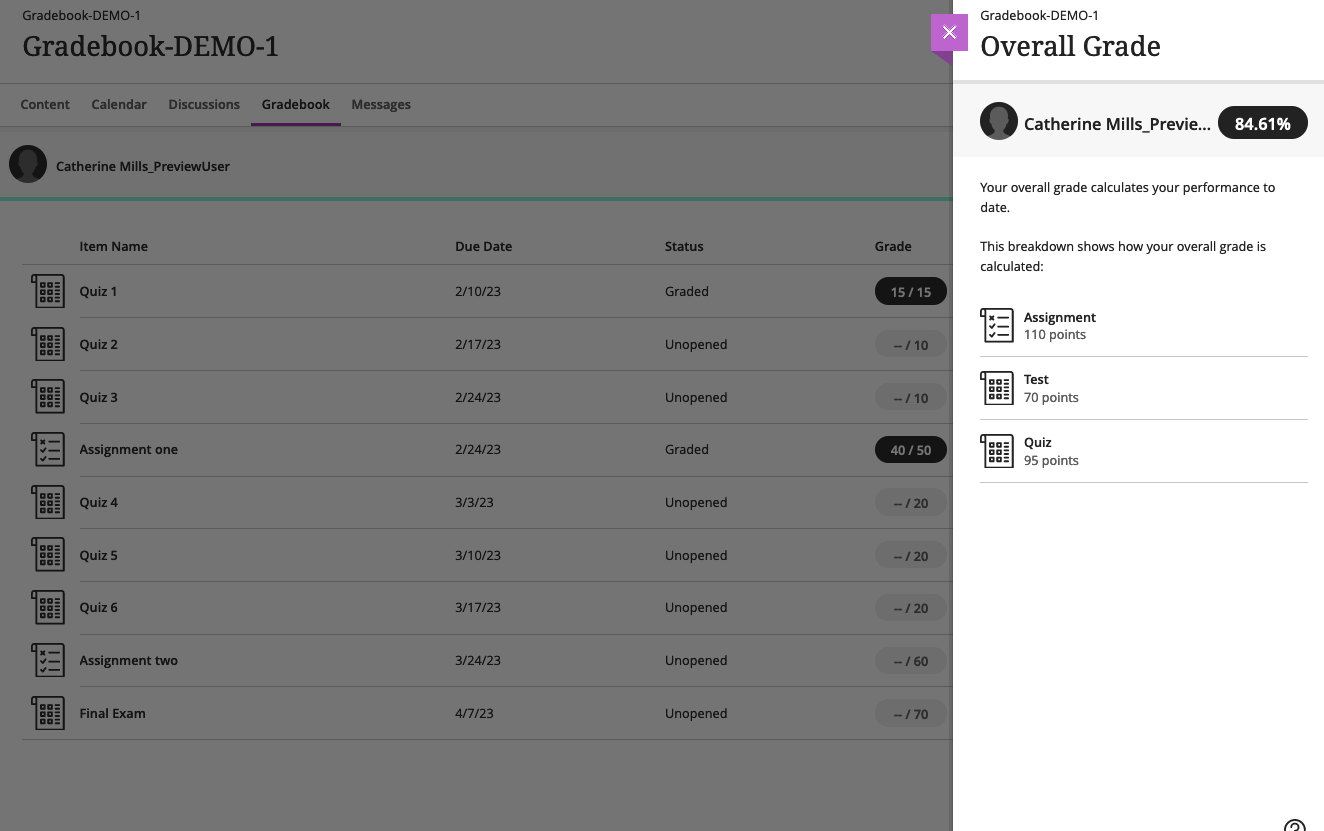 Students can see their Overall Grade breakdown by clicking on it in the Gradebook. When items are in categories, they do not see their scores for individual items.