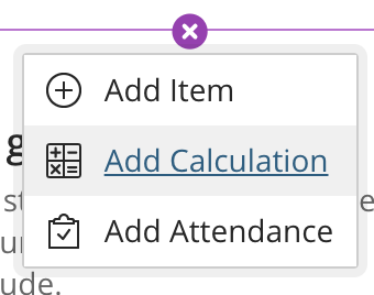 Calculation: Use ‘Add calculation’ when computing a formula-based calculation (e.g., sum of all tests) based on other graded items. As above, you can give the calculation a name, which will appear as a row in the student gradebook.