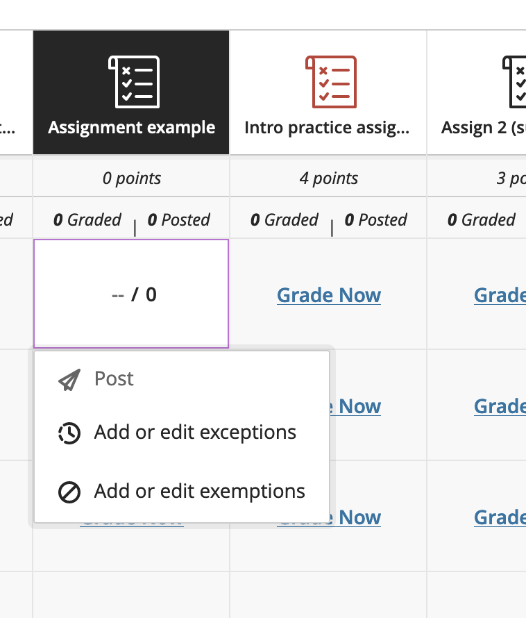 Grades view: Click on the respective cell for the student and assessment and then click Add or edit exceptions or exemptions. .