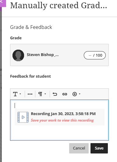 Gradebook: By adding feedback to a Gradable Item using the Blackboard Recording tool