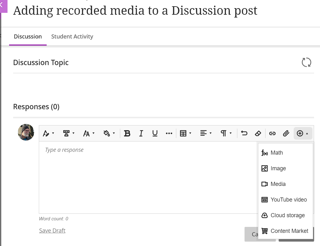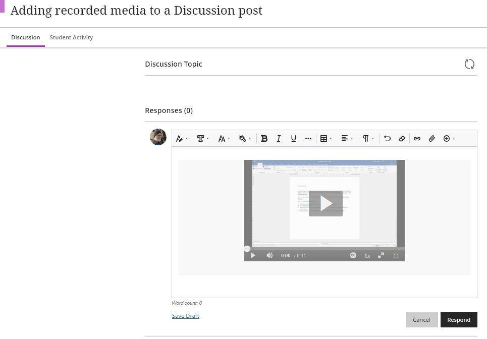 Providing video feedback directly in a discussion or journal can be very effective in continuing the discussion back and forth between students. To do this, you can add a Kaltura video (with your feedback) directly in the discussion or journal.