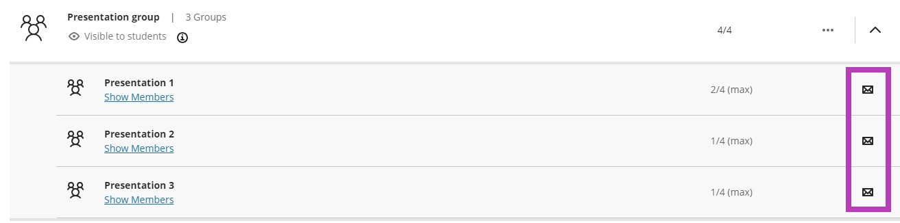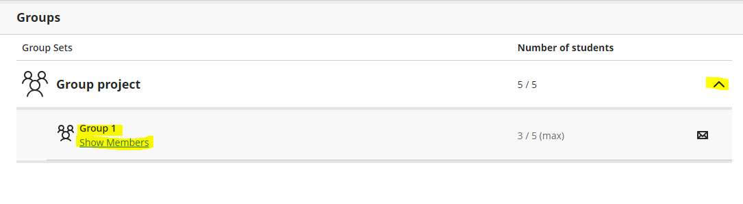 Send message to Group: Click on the down arrow for the Group Set and click on the envelope icon for the group you wish to message. Students can also message their group from here.