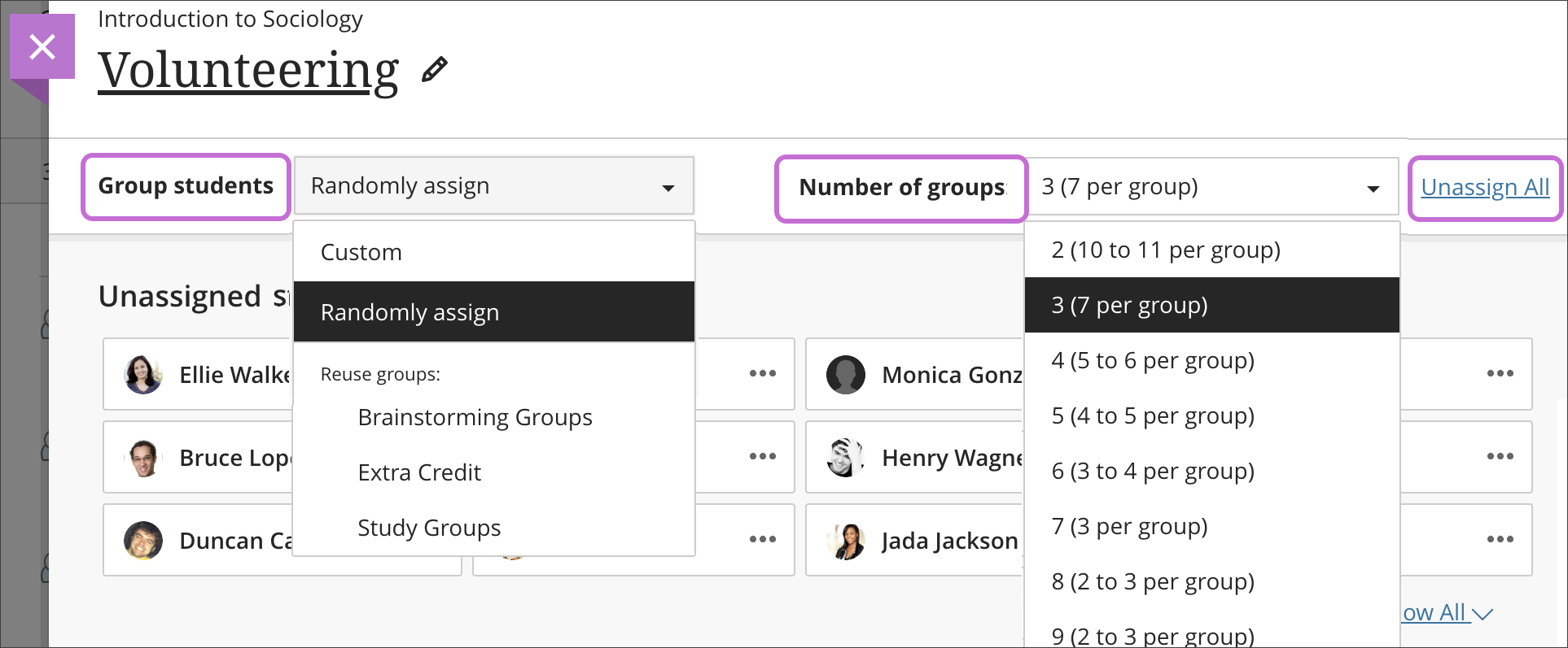In the Number of groups drop down menu, select how many groups to create. Click Unassign All to remove students from groups.