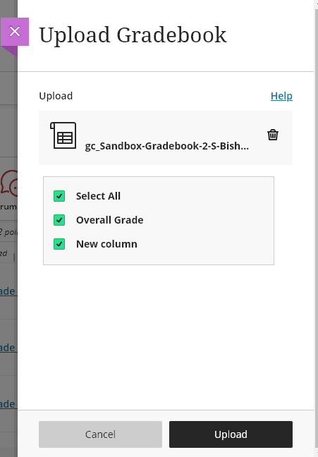 Select all the columns you would like to add to the Gradebook. Click Upload.