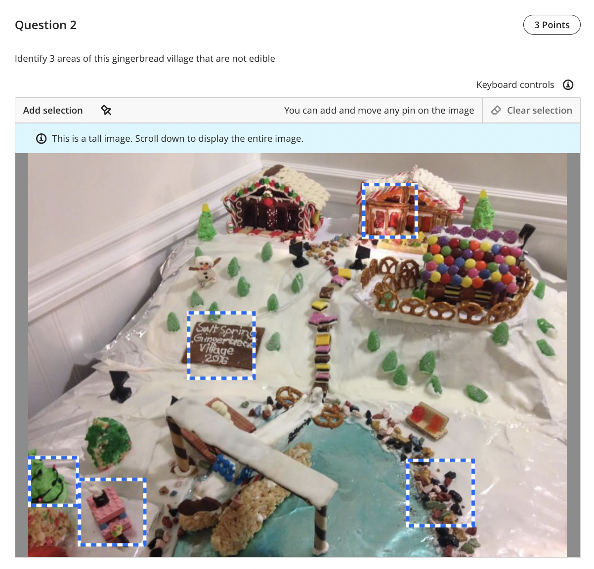 Hotspot questions present students with an image that requires them to drop a pin on one or more hotspots created by you, the instructor, within that image.