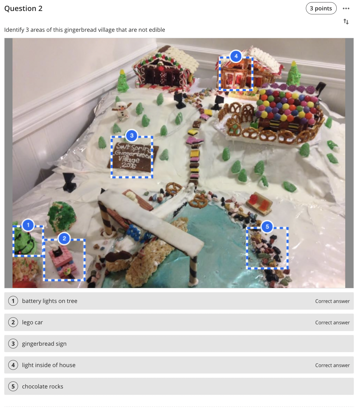 Instructor view: A question with 3 correct hotpots and two incorrect ones.